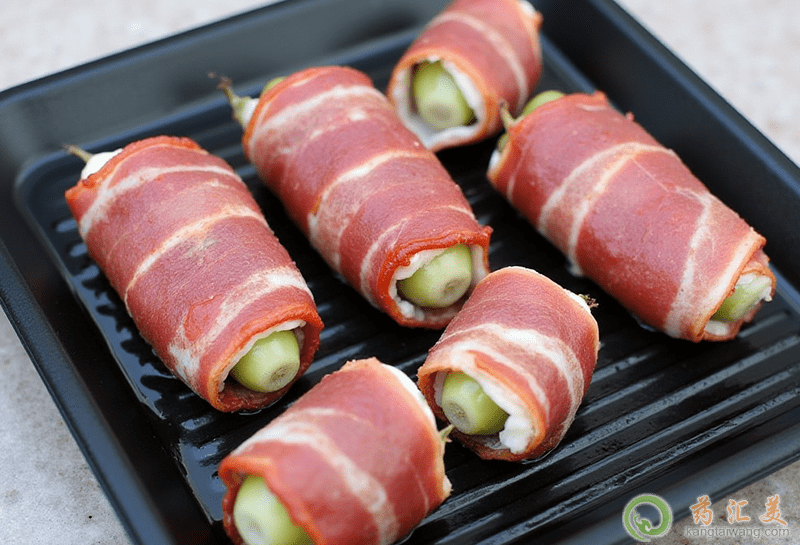 2.培根選用新鮮的帶皮五花肉,分割成塊,用鹽和少量亞硝酸鈉或硝酸鈉、黑胡椒、丁香、香葉、茴香等香料腌漬,再經風干或熏制而成,具有開胃祛寒、消食等功效。