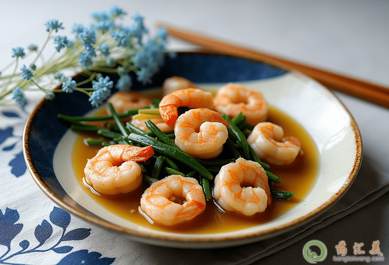 韭菜炒蝦肉,使用新鮮的蝦與韭菜、生姜以及適量的精鹽,把蝦的腸與殼去掉后清洗干凈,再把片放到鍋里面暴香,之后把蝦放進去并炒到八成熟時,再把韭菜放進去,稍微炒一下之后再加入適量的精鹽就可以了,這個菜有著溫中行氣以及固精止遭的作用。