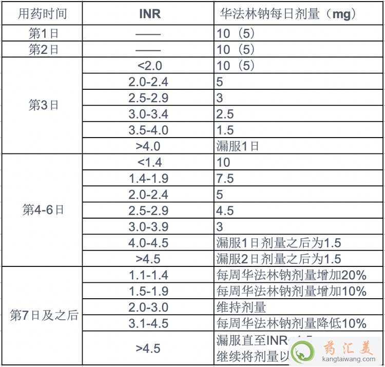 3、對于老年患者、體型較小、自然INR高于1.2或患有其他疾病(詳見用藥前須知)或正服用其他可影響抗凝治療效果藥物的患者(詳見藥物相互作用),推薦連續前2日開始劑量為5mg,依據治療第3日患者INR按以下表所列劑量繼續治療。詳情請遵醫囑。