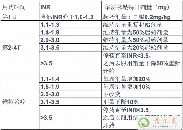 1、正常體重患者及自然INR低于1.2者,在前3日內使用10mg華法林鈉治療。依據治療第4日量度出的INR值按下表所列劑量繼續治療。詳情請遵醫。