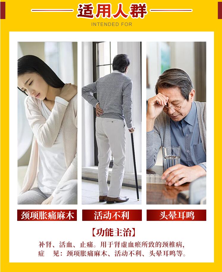補腎、活血、止痛。用于腎虛血瘀所致的頸椎病,癥見:頸項脹痛麻木、活動不利、頭暈耳鳴等。