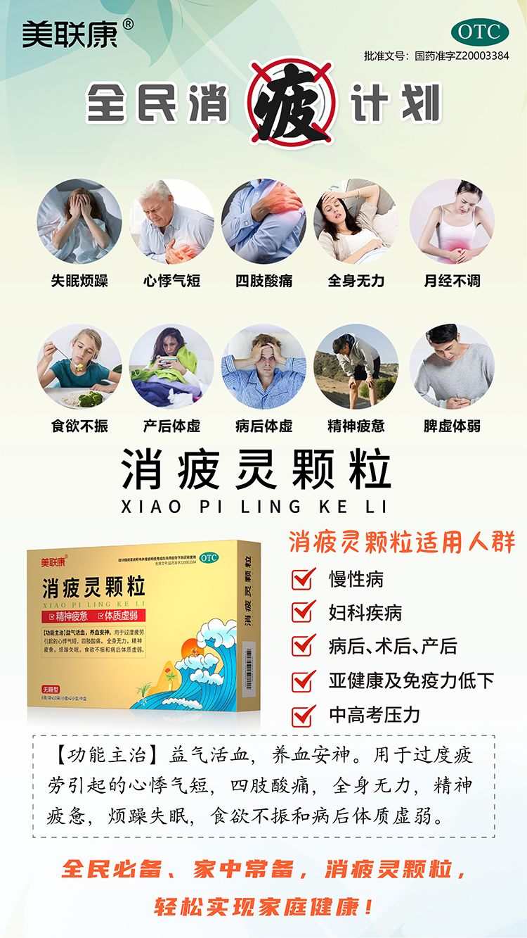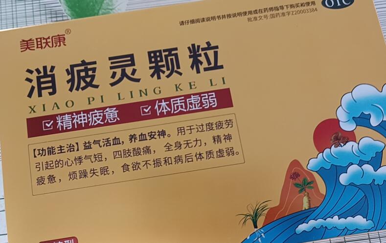 答消疲靈顆粒有益氣養(yǎng)血,活血安神的功效,由14味名貴中藥組合而成,主要是用于過度疲勞所引起的相關(guān)癥狀,可以改善患者心悸氣短、四肢酸痛、全身無(wú)力、精神疲憊、煩躁失眠、食欲不振等多個(gè)癥…