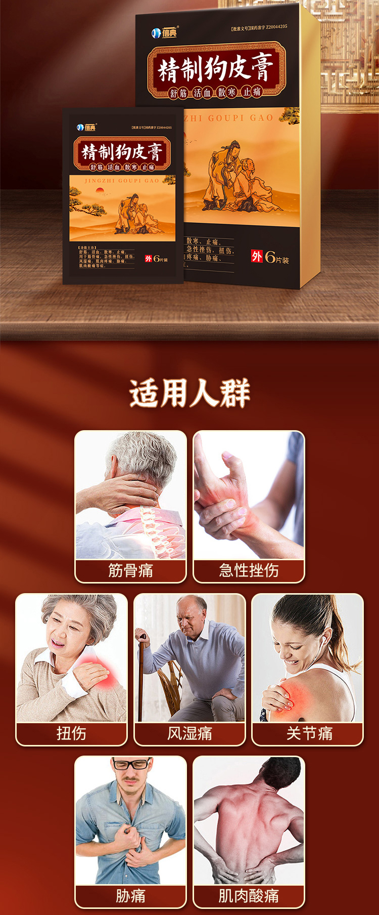 2、風(fēng)濕疼痛:精致狗皮膏+風(fēng)濕定膠囊片